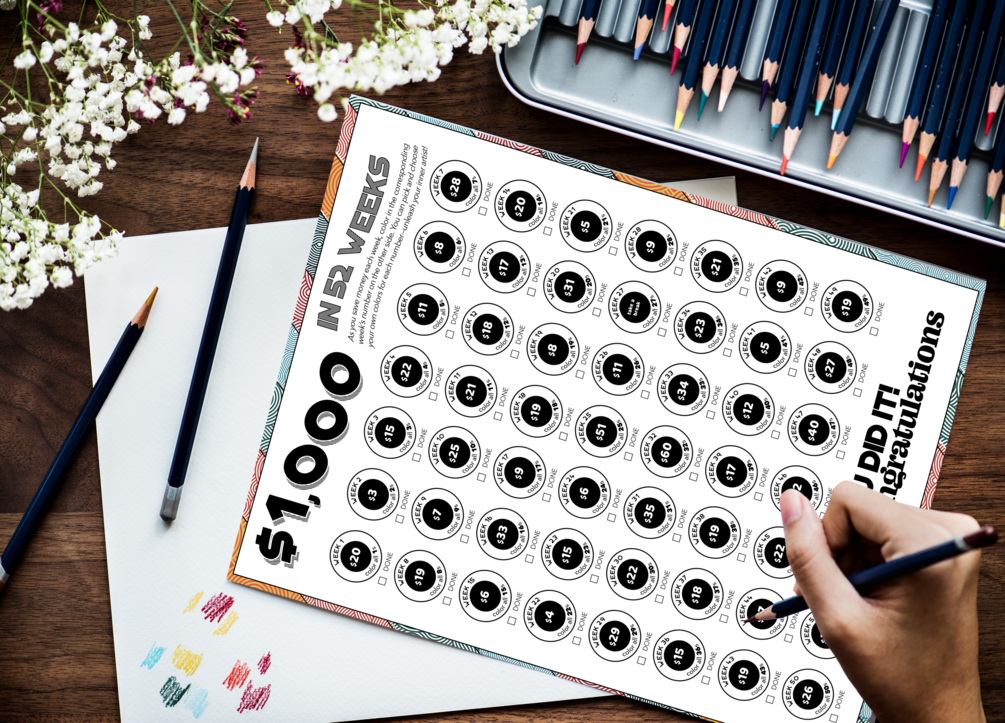 Saving money doesn't have to be so hard. Use this savings tracker to save $1,000 by the end of this year! ($5,000 goal also included). By the end of the year, you will be $1,000 richer and you'll have a completed color-by-number art piece to commemorate it!